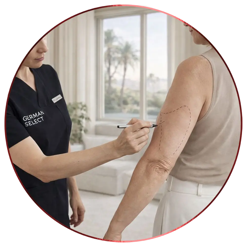 Removes excess upper arm skin and restores proportion. European surgical standards combined with guided treatment and recovery in Hurghada.